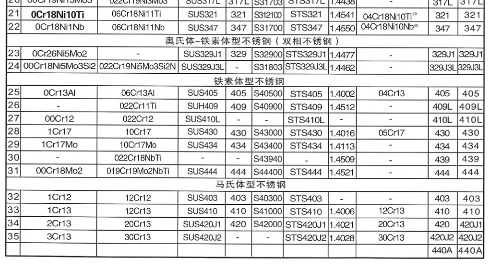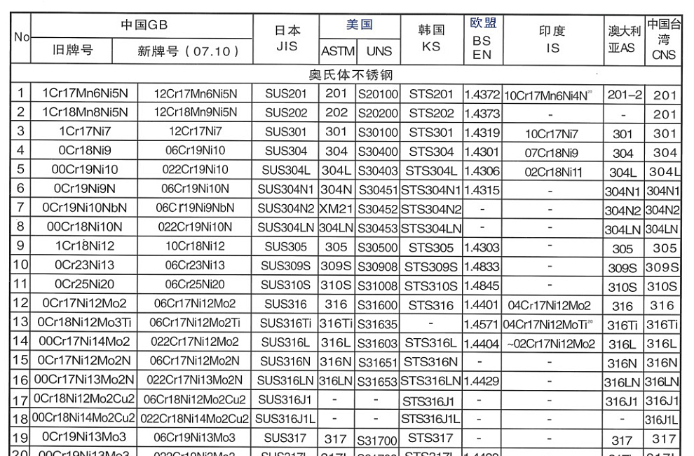 不锈钢牌号对照表